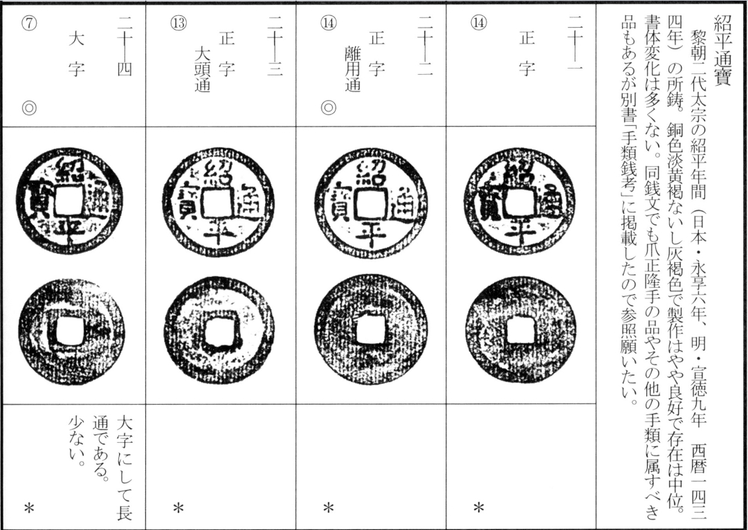 译文:后黎朝第二位皇帝太宗绍平年间(绍平元年为日本永享六年,明宣德九年,公元1434年)铸绍平通宝。此钱呈淡黄褐至灰褐色铜质,铸造较为精良,存世量为中等。绍平通宝书体变化较少,同钱文者中亦含"爪正隆手"等特殊版式,详见另著《手类钱考》专论 。
