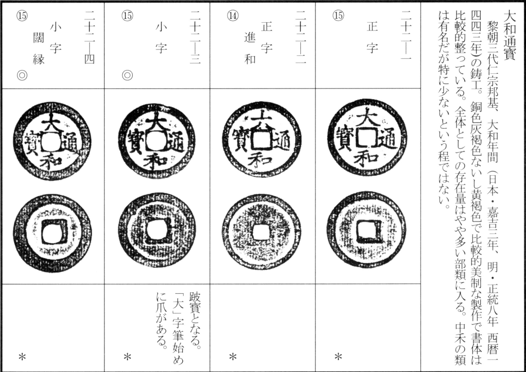 译文:后黎朝第三位皇帝仁宗(黎邦基)于大和年间(大和元年为日本嘉吉三年,明正统八年,公元1443年)铸大和通宝。大和通宝铜质呈灰褐至黄褐色,制作较为精良,书法相对规整。整体存世量偏多,"中禾"类虽为名品,但未达罕见等级。