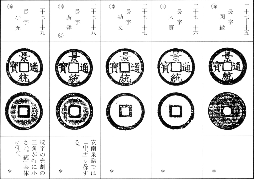 译文:后黎朝第六位皇帝宪宗景统年间(景统元年为日本明应七年,明弘治十一年,公元1498年)铸景统通宝。景统通宝存世数量中等偏多,但字体版式变化较少。钱体厚重、文字深峻纤细,整体铸造工艺极为精美,是反映后黎朝鼎盛时期的重要实物资料。关于景统钱的版别分类,日本埼玉县堀氏的研究最为系统,学界多依从其说。