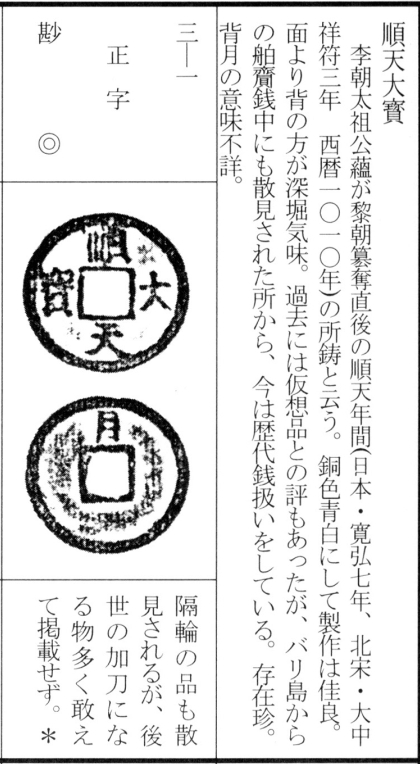 译文:李朝太祖李公蕴篡夺前黎朝后不久,在顺天年间(日本宽弘七年,北宋大中祥符三年,公元1010年)铸顺天大宝。该钱铜质呈青白色,铸造工艺精良,钱背较钱面更为深峻。此钱历史上曾被视为臆造品,但因在巴厘岛流入的舶来钱币中屡有发现,现已被认定为正式流通货币。存世稀少,背纹月痕寓意尚未明确。