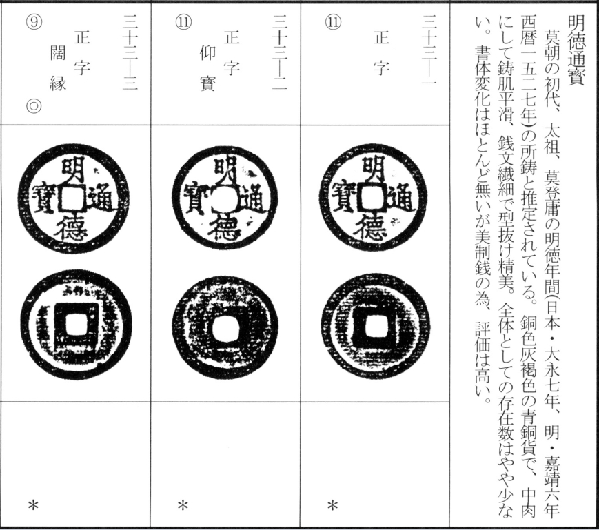 译文:莫朝开国太祖莫登庸明德年间(明德元年为日本大永七年,明嘉靖六年,公元1527年)推测铸造过明德钱。明德通宝钱体呈浅褐色青铜质地,中等厚度且表面平滑,钱文纤细、铸造精美。整体存世量较为稀少。虽版式变化甚少,但因铸造精良,在收藏界享有很高评价。