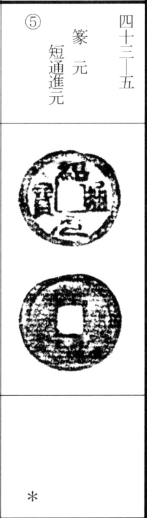 译文:绍元通宝推测为十四世纪后半叶陈朝所铸,因年号不详特此附图说明。虽在《手类钱考》中已被列为"嵌込手"版式,但其制作工艺、铜质特征与前载"绍丰通宝"极为相似,且存在字体变异,故按历代正铸钱币处理。二者存世均甚稀少。另需探讨:此钱与同文异制的"圣元手"及"安法手"版式之间是否存在关联?