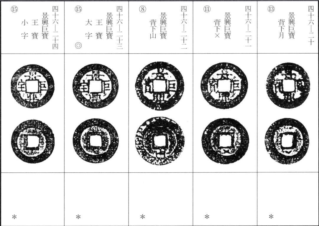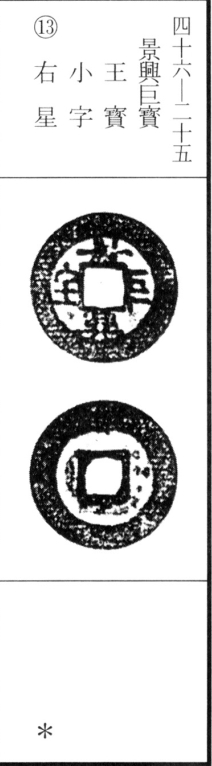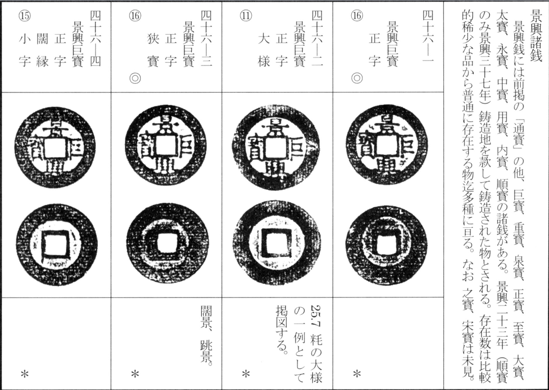 译文:景兴钱除前文所述"通宝"外,尚有巨宝、重宝、泉宝、正宝、至宝、大宝、太宝、永宝、中宝、用宝、内宝、顺宝等各类钱文。据考这些钱币多铸于景兴二十三年(惟"顺宝"为景兴三十七年铸造),部分铸有铸造地铭文。其存世量差异悬殊,自相对稀见至普通常见者皆有。另需说明,之宝、宋宝钱迄今未见实物存世。