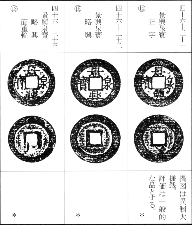 景兴钱除通宝外,尚有巨宝、重宝、泉宝、正宝、至宝、大宝、太宝、永宝、中宝、用宝、内宝、顺宝等各类钱文。据考这些钱币多铸于景兴二十三年(惟"顺宝"为景兴三十七年铸造),部分铸有铸造地铭文。其存世量差异悬殊,自相对稀见至普通常见者皆有。另需说明,之宝、宋宝钱迄今未见实物存世。