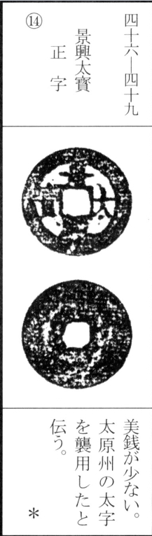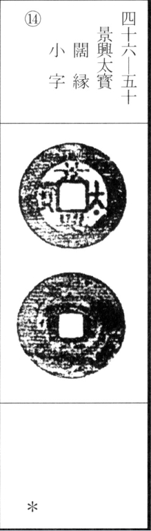 景兴钱除通宝外,尚有巨宝、重宝、泉宝、正宝、至宝、大宝、太宝、永宝、中宝、用宝、内宝、顺宝等各类钱文。据考这些钱币多铸于景兴二十三年(惟"顺宝"为景兴三十七年铸造),部分铸有铸造地铭文。其存世量差异悬殊,自相对稀见至普通常见者皆有。另需说明,之宝、宋宝钱迄今未见实物存世。