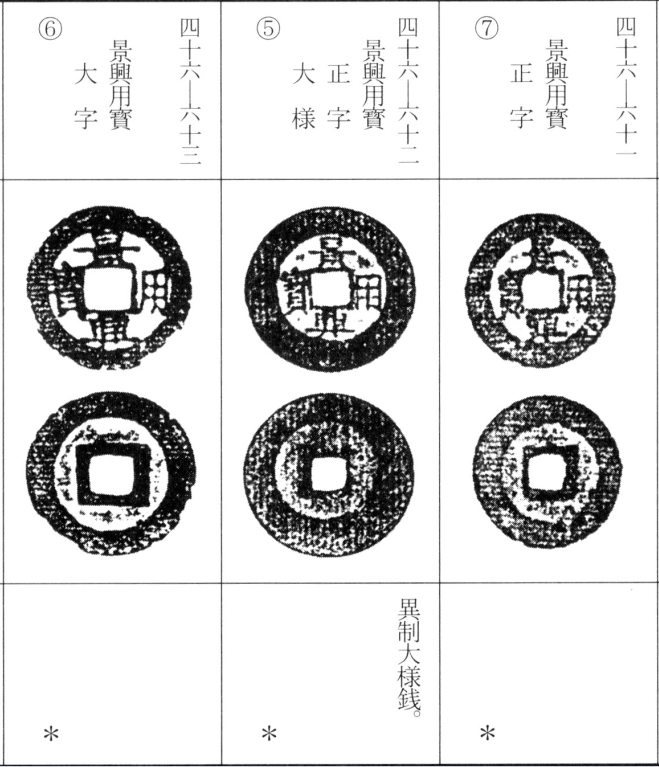 景兴钱除通宝外,尚有巨宝、重宝、泉宝、正宝、至宝、大宝、太宝、永宝、中宝、用宝、内宝、顺宝等各类钱文。据考这些钱币多铸于景兴二十三年(惟"顺宝"为景兴三十七年铸造),部分铸有铸造地铭文。其存世量差异悬殊,自相对稀见至普通常见者皆有。另需说明,之宝、宋宝钱迄今未见实物存世。