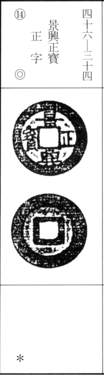 景兴钱除通宝外,尚有巨宝、重宝、泉宝、正宝、至宝、大宝、太宝、永宝、中宝、用宝、内宝、顺宝等各类钱文。据考这些钱币多铸于景兴二十三年(惟"顺宝"为景兴三十七年铸造),部分铸有铸造地铭文。其存世量差异悬殊,自相对稀见至普通常见者皆有。另需说明,之宝、宋宝钱迄今未见实物存世。