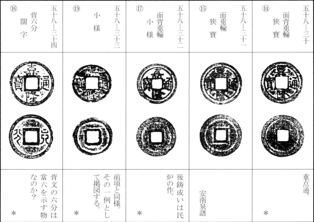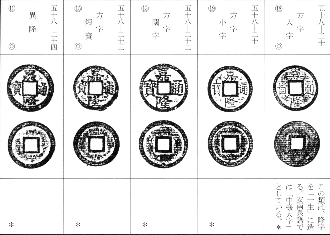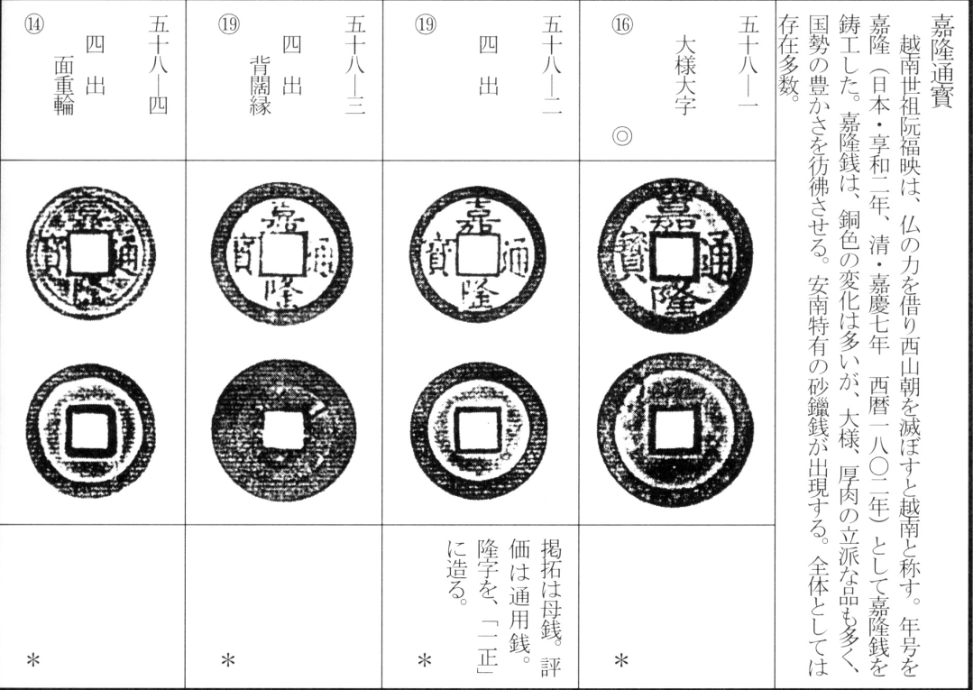 译文:越南(指阮朝)世祖阮福映灭西山朝后,改国号为"越南",并于嘉隆年间(嘉隆元年为日本享和二年,清嘉庆七年,公元1802年)始铸嘉隆通宝。此钱虽铜色变化丰富,然多见形制硕大、质地厚重的精品,足见当时国势之昌隆。其间更出现安南特有的砂鑑钱,该钱整体存世量甚巨。