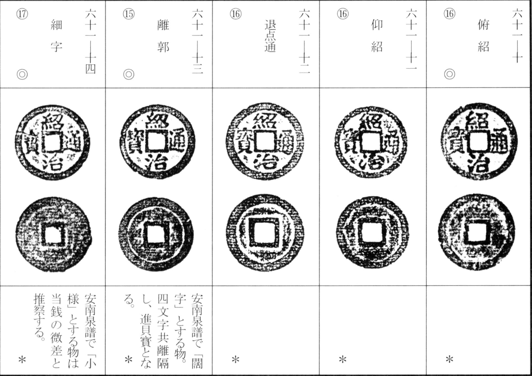译文:绍治通宝为越南阮朝第三位皇帝宪祖章帝(绍治帝)绍治年间(绍治元年为日本天保十二年,清道光二十一年,公元1841年)所铸。除黄铜钱与砂鑼钱(粗铸劣质钱)外,亦有大钱(美号大钱)存世。大钱铸造精良、工艺精湛,详情可参阅梦雲大库氏之专著。整体存世量较多,除细微差异外,钱文书体变化较少。目前尚未发现背文‘河内’之品。