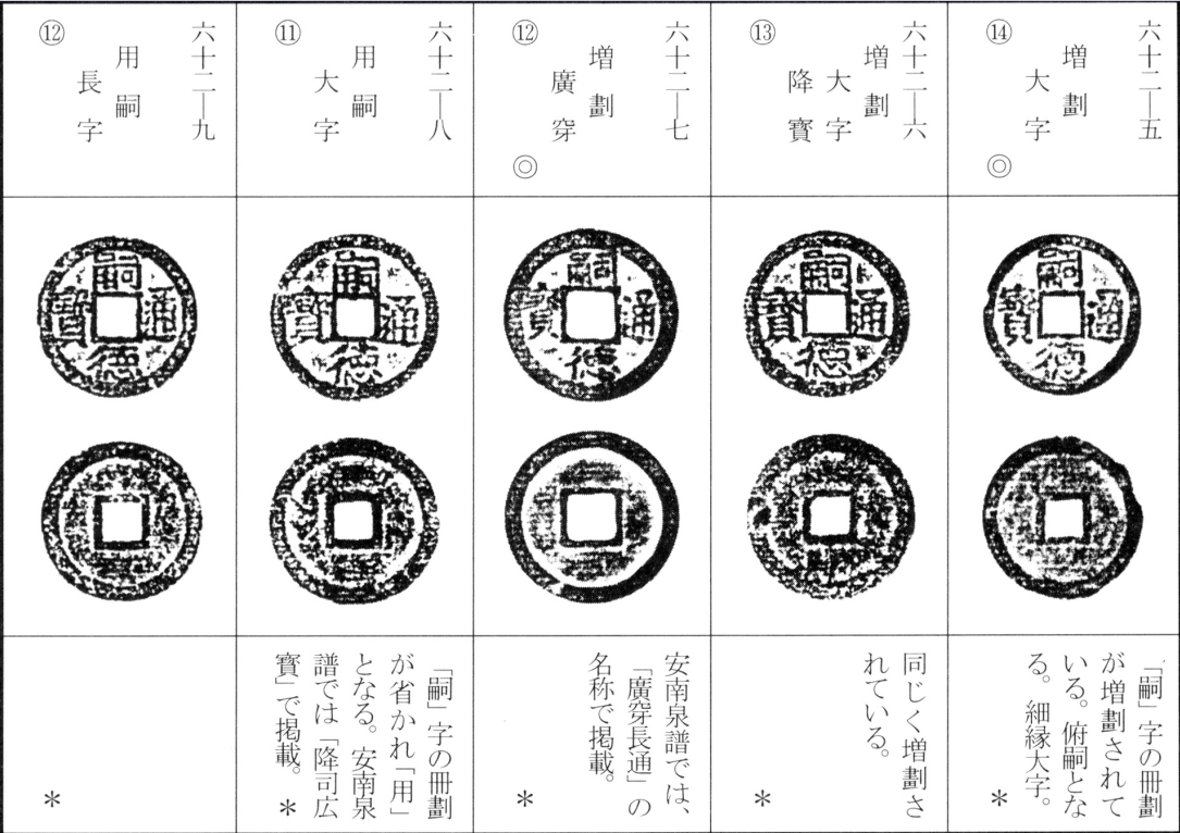 译文:嗣德通宝为越南阮朝第四位皇帝翼宗英帝(嗣德帝)嗣德年间(嗣德元年为日本嘉永元年,清道光二十八年,公元1848年)所铸。钱币材质包括黄铜与砂鑑(粗铸劣质铜钱),其中官方铸造的钱币工艺精良、文字规整,而民间私铸品则粗劣且字体变形。与明命、绍治钱类似,除背面铸有吉语的大钱(美号大钱)外,还有‘嗣德宝钞’和‘嗣德重宝’等钱币。