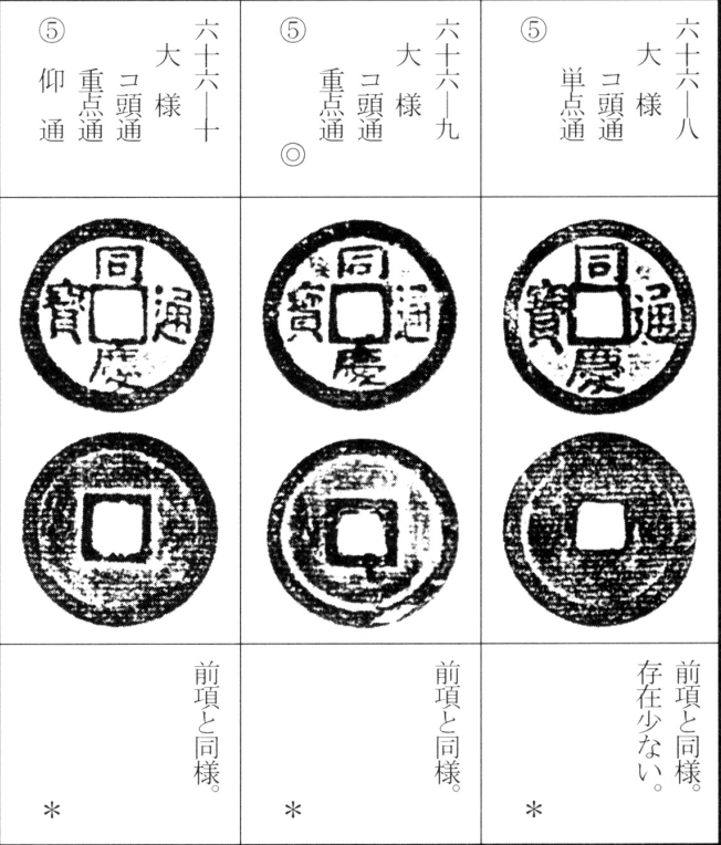 译文:咸宜帝之后由第九位皇帝景宗纯帝(亦称同庆帝)继位,改国号为"大南"。其治世仅五年,故该钱存世量不甚丰沛。钱体多呈淡黄色铜质,间有微带赤色者。其中小型钱当六文通行,大型钱虽无明确兑换标识,然学界多认定为当十文(可参阅梦雲大库氏相关论述)。