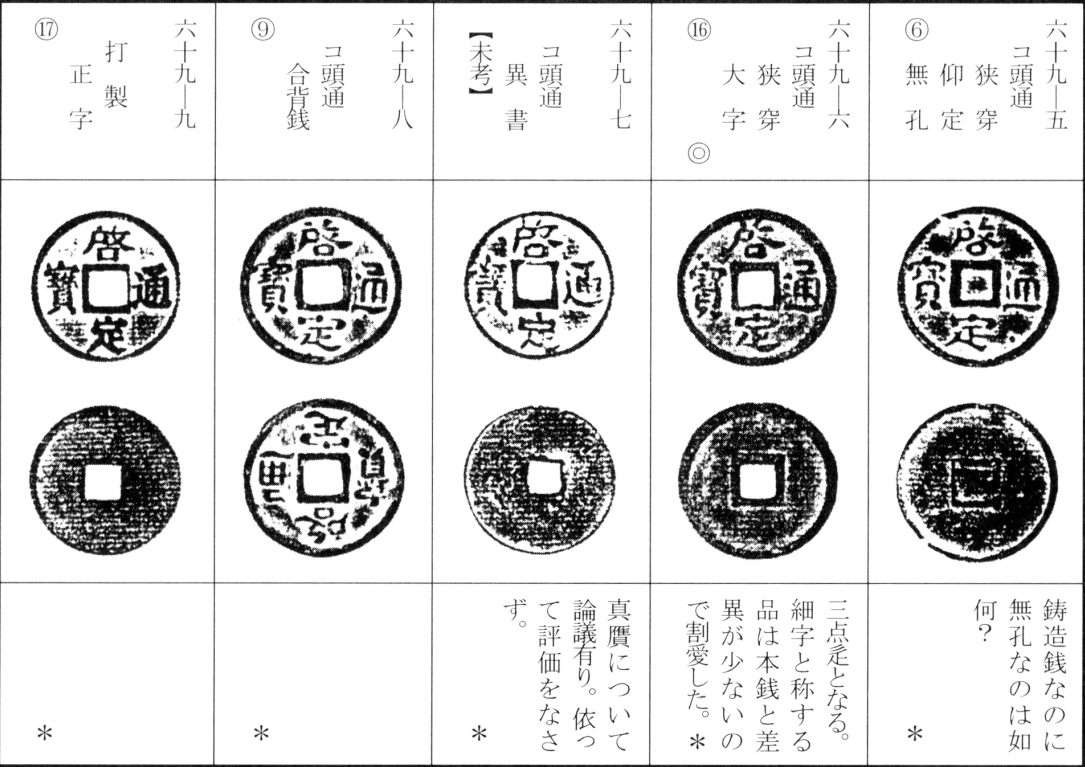 译文:如前所述,法国以维新帝密谋叛乱为由将其流放,改立同庆帝之子福昶为阮朝第十二位皇帝启定帝(启定元年为日本大正五年,公元1916年)。启定通宝分为铸造钱与打制钱两类:前者兼有赤铜与黄铜材质,后者则仅见黄铜。据考,打制钱系法国铸造后再运回越南。