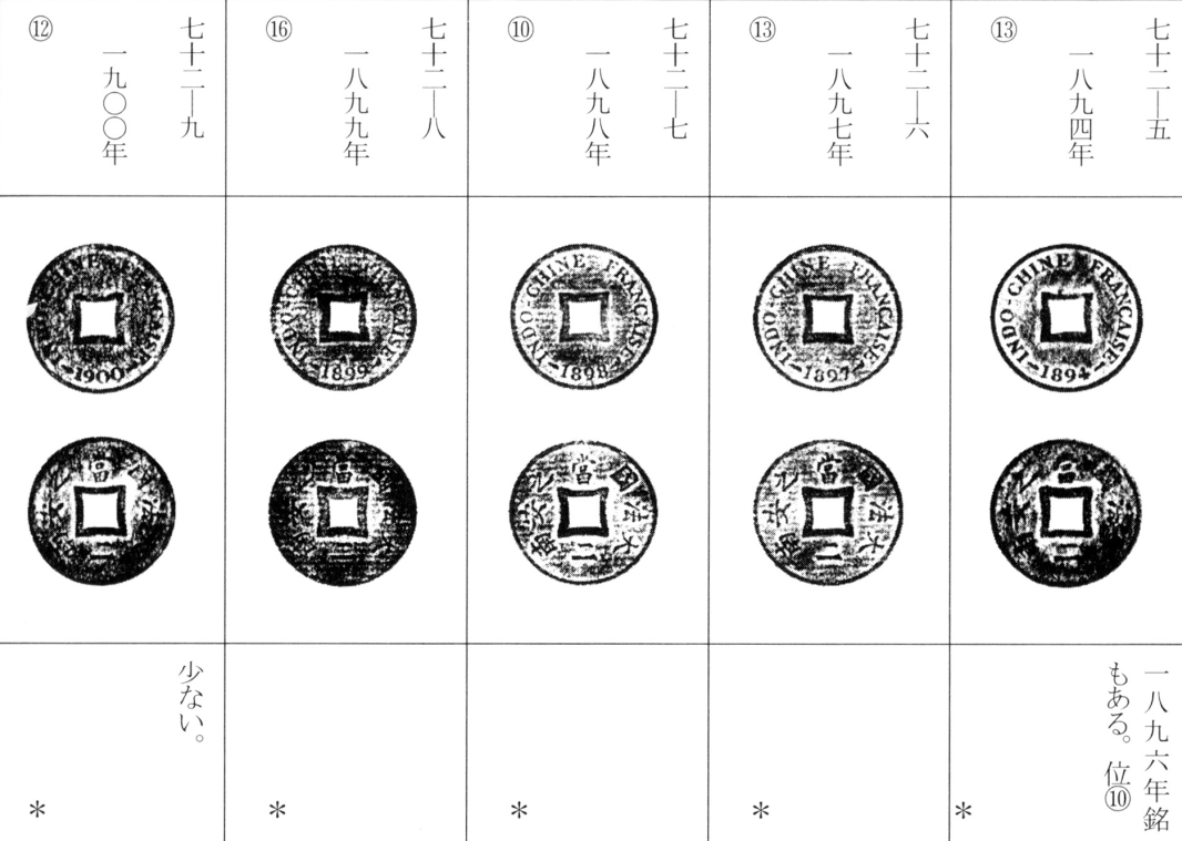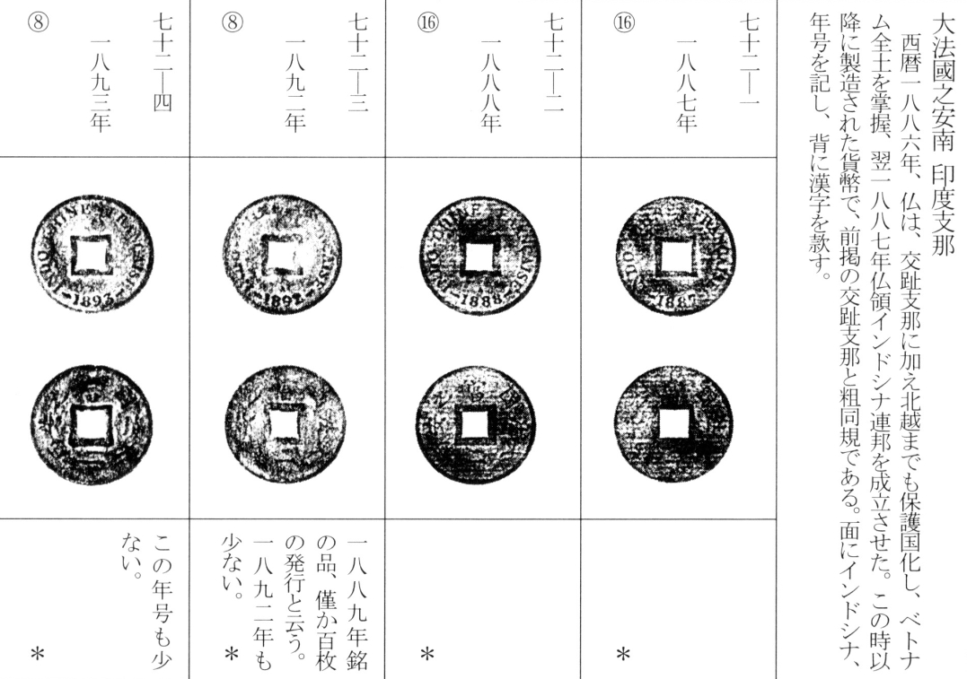 此后制造的货币,与前述的交趾支那货币大致规格相同。正面记有“印度支那”和纪年,背面刻有汉字款识。