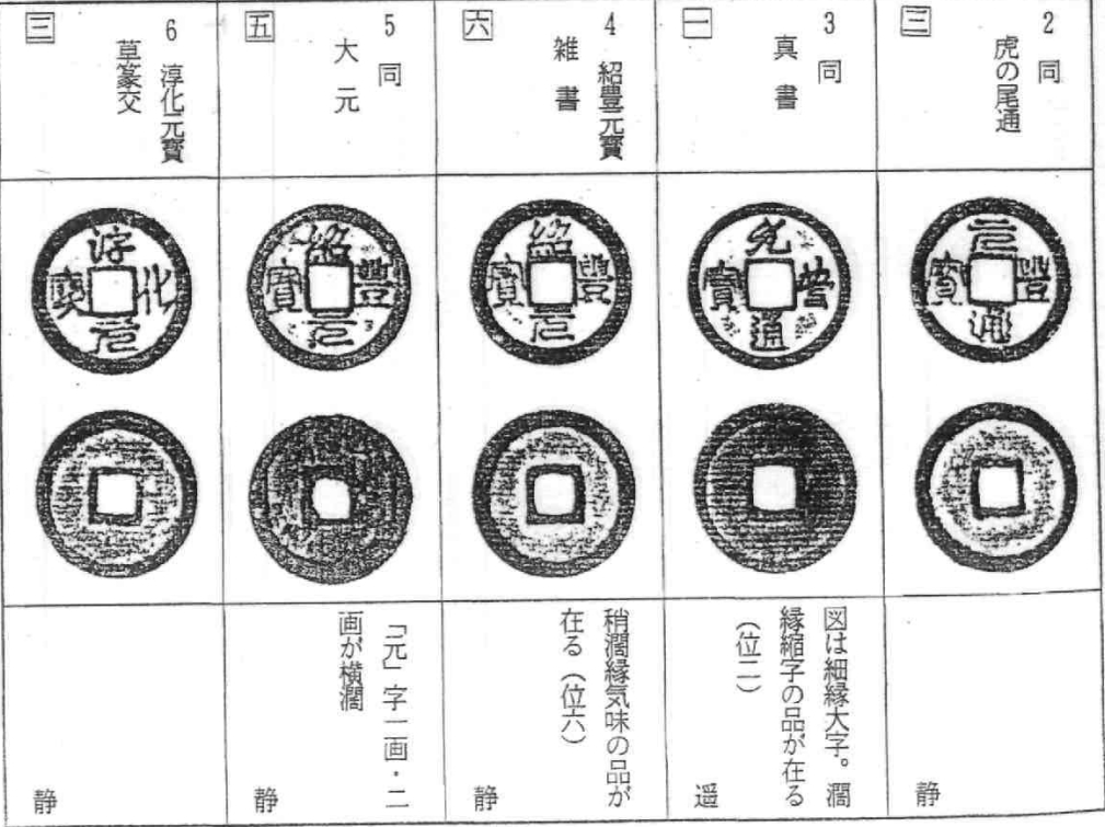 译文:陈朝第七位皇帝裕宗在位时,绍丰元年(1341年)铸造了“绍丰元宝”。其中被称作“杂书”的钱币作为代表钱,自古以来就被赋予表记类的名称。其铜色淡黄白色,虽稍薄但制作精良,钱径也颇为标准。过去这类钱币大多稀少,近年因越南舶来而数量增多,变得较易入手。同类之中,元丰通宝被认定为陈朝初期太宗元丰年间(元年为1251年)所铸,本应按历代钱币的惯例归类,但沿袭旧例归类为手类钱并附图记录。钱文风格新颖,是安南独有的奇异篆书体,不过也有将单个字写成行书的,与北宋钱币的区分并不困难。