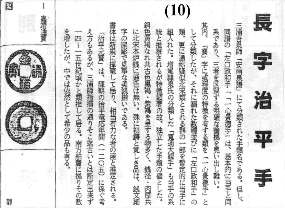 译文:长字治平手是三浦吾泉先生在《安南泉谱》中所分类的手类名称。但是需要注意的是,该谱中的“左口政和手”与“一心景德手”基本与长字治平手属于同一系统,三者之间难以找到明确的区分依据。