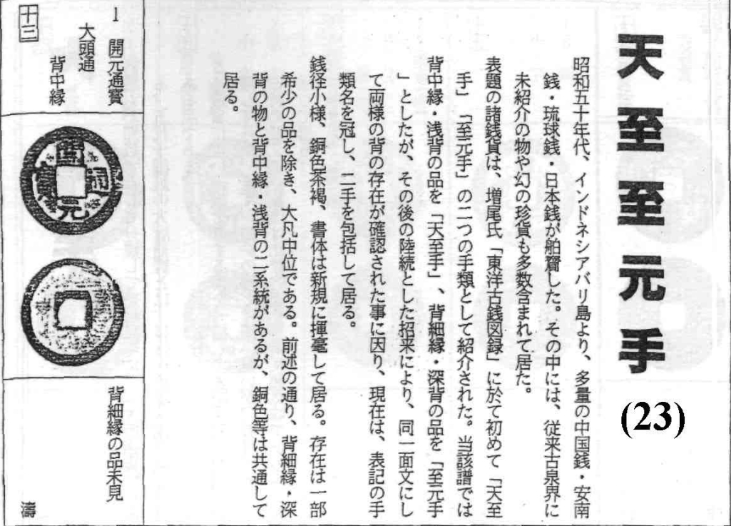 译文:昭和时期的五十年代,从印度尼西亚巴厘岛有大量的中国钱、安南钱、琉球钱、日本钱(日本钱算回流)流入日本。其中,包含了许多以前古泉界从未介绍过的和传说中的珍稀钱币。
