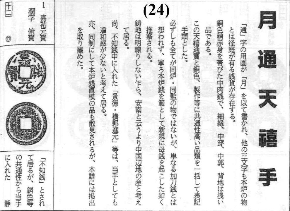 译文:有一种“通”字的“用”部写成“月”,且其他三个字也与北宋官炉钱有明显差异的钱币(此处指天禧通宝)。