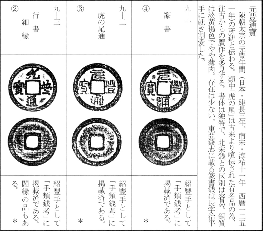 译文:陈朝太宗元丰年间(日本建长三年,南宋淳祐十一年,公元1251年)铸元丰通宝。此版式中所谓"虎尾"式,自古即为泉界名品,故历代仿铸甚多。钱文风格独特,与北宋钱币明显可辨。铜质呈淡黄褐色,钱体稍显薄小。存世较少。东亚钱志所载篆书钱因与"长字治平"版式雷同,在此不赘述。