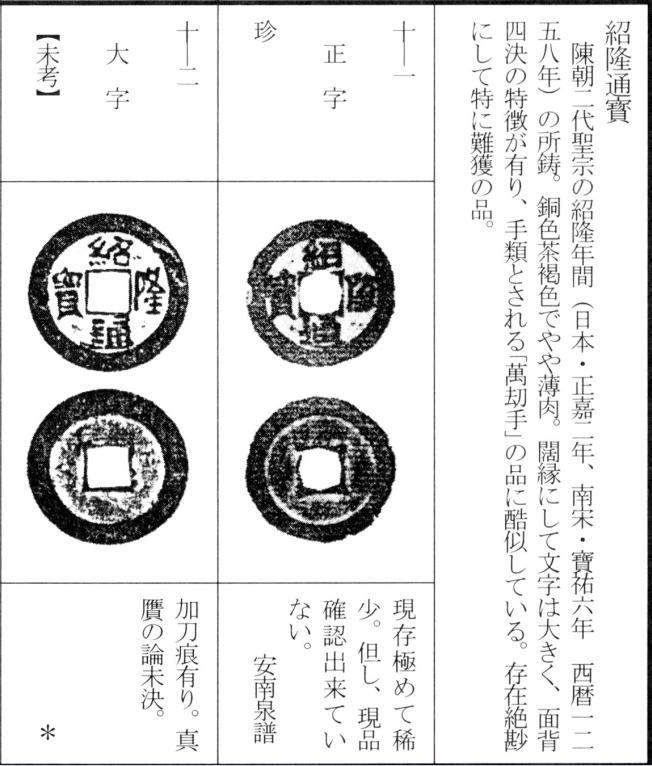 译文:陈朝第二位皇帝圣宗于绍隆年间(日本正嘉二年,南宋宝祐六年,公元1258年)铸绍隆通宝。此钱呈茶褐色铜质,钱体略薄,具有阔缘大字、面背四决的典型特征,与"万劫手"类钱币极为相似。此钱存世绝少,难得一见。