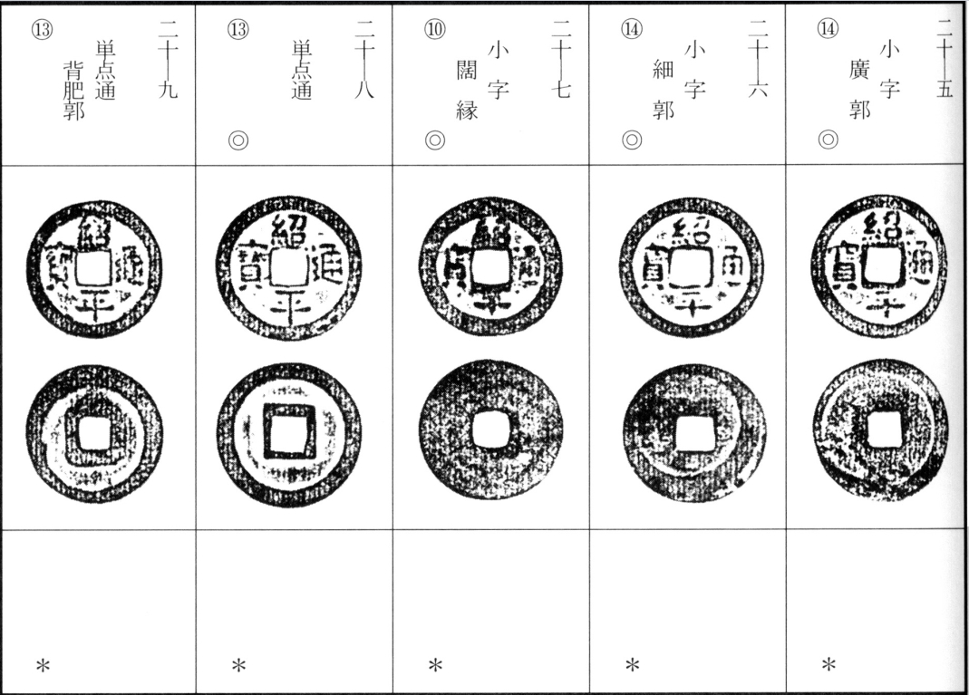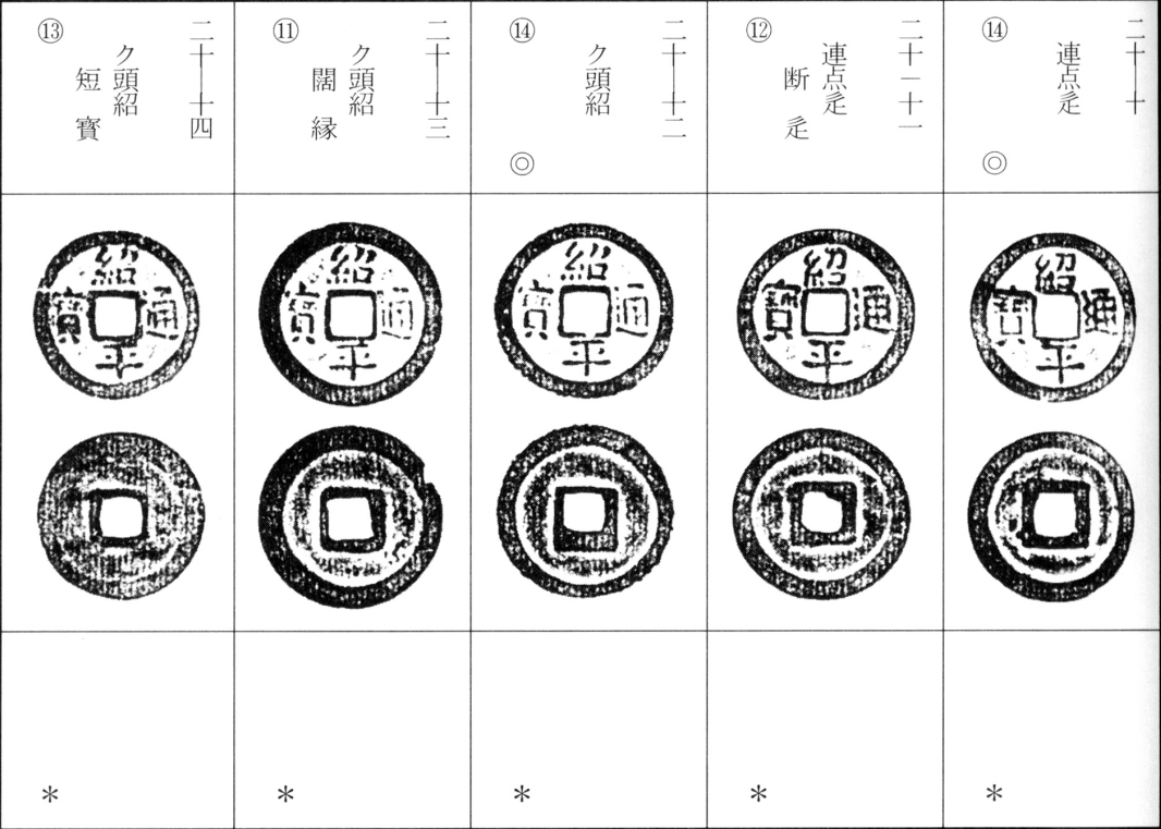 译文:后黎朝第二位皇帝太宗绍平年间(绍平元年为日本永享六年,明宣德九年,公元1434年)铸绍平通宝。此钱呈淡黄褐至灰褐色铜质,铸造较为精良,存世量为中等。绍平通宝书体变化较少,同钱文者中亦含"爪正隆手"等特殊版式,详见另著《手类钱考》专论 。