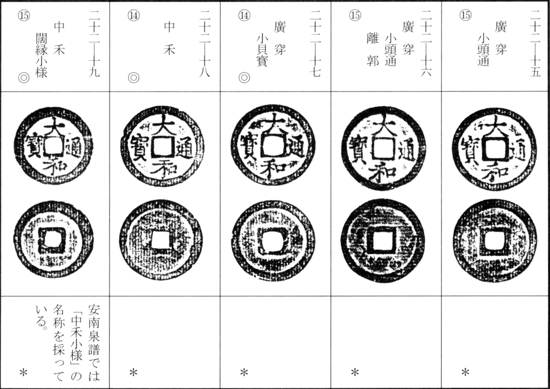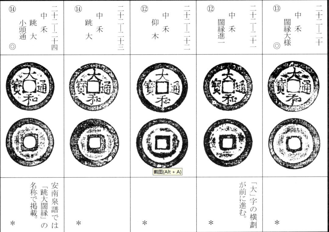 译文:后黎朝第三位皇帝仁宗(黎邦基)于大和年间(大和元年为日本嘉吉三年,明正统八年,公元1443年)铸大和通宝。大和通宝铜质呈灰褐至黄褐色,制作较为精良,书法相对规整。整体存世量偏多,"中禾"类虽为名品,但未达罕见等级。