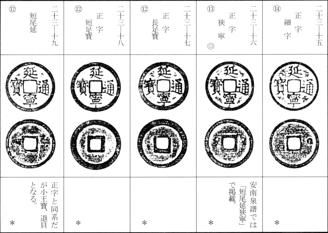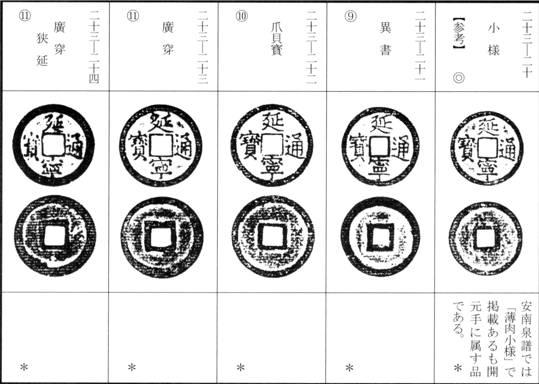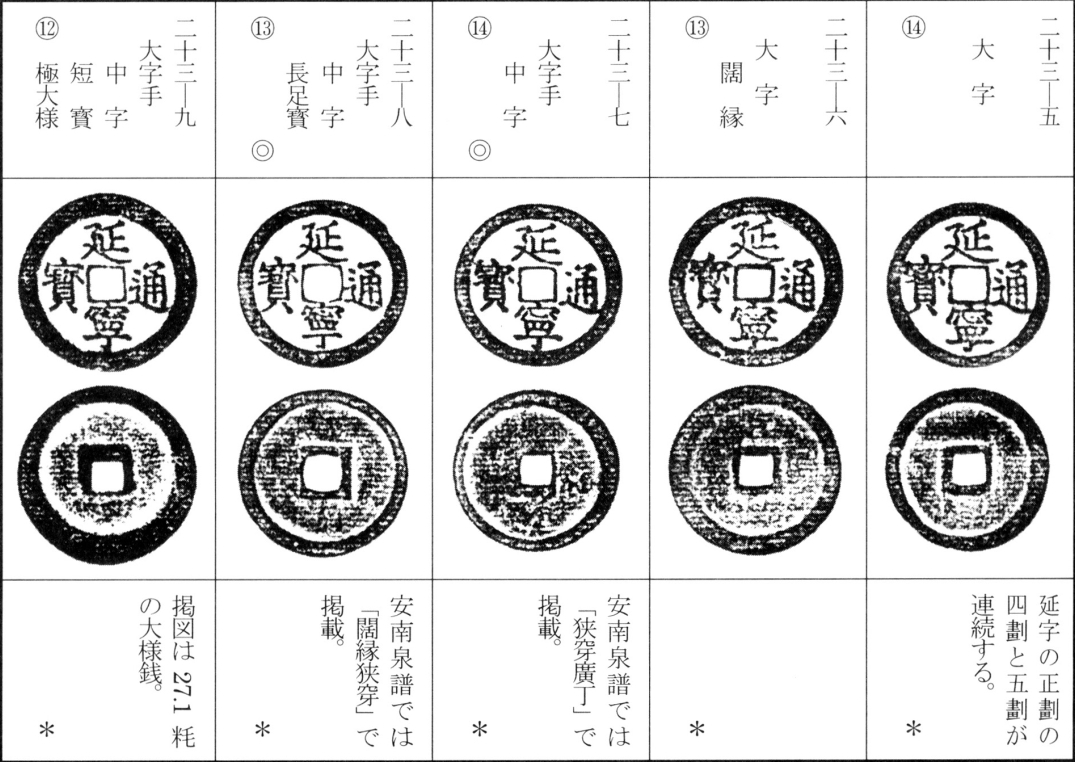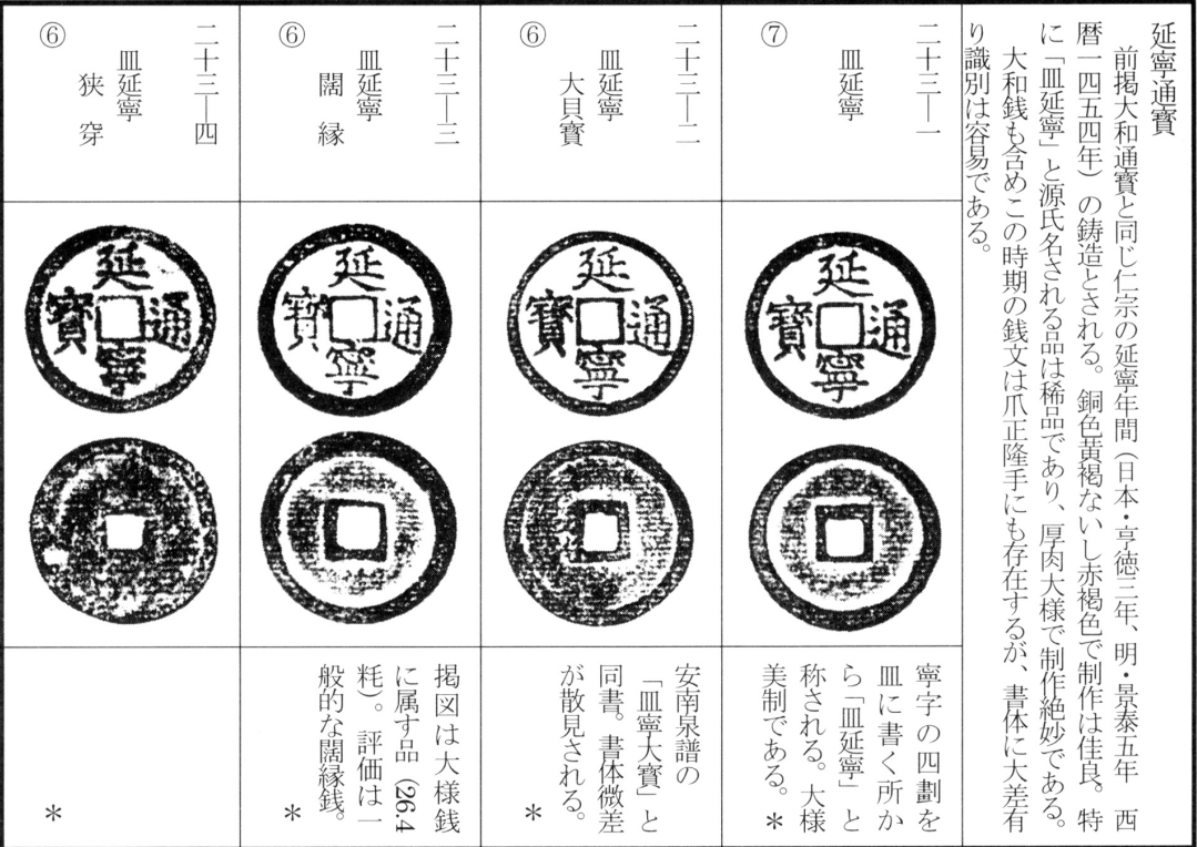 译文:后黎朝仁宗于延宁年间(延宁元年为日本亨德三年,明景泰五年,公元1454年)铸延宁通宝,与大和通宝同属仁宗铸币。此钱呈黄褐至赤褐色铜质,铸造精良。有特大和等版别,也有爪正隆手类版别。皿延宁为稀少版别。以厚肉大样与制作精美著称,各版式差异显著,辨识度较高。