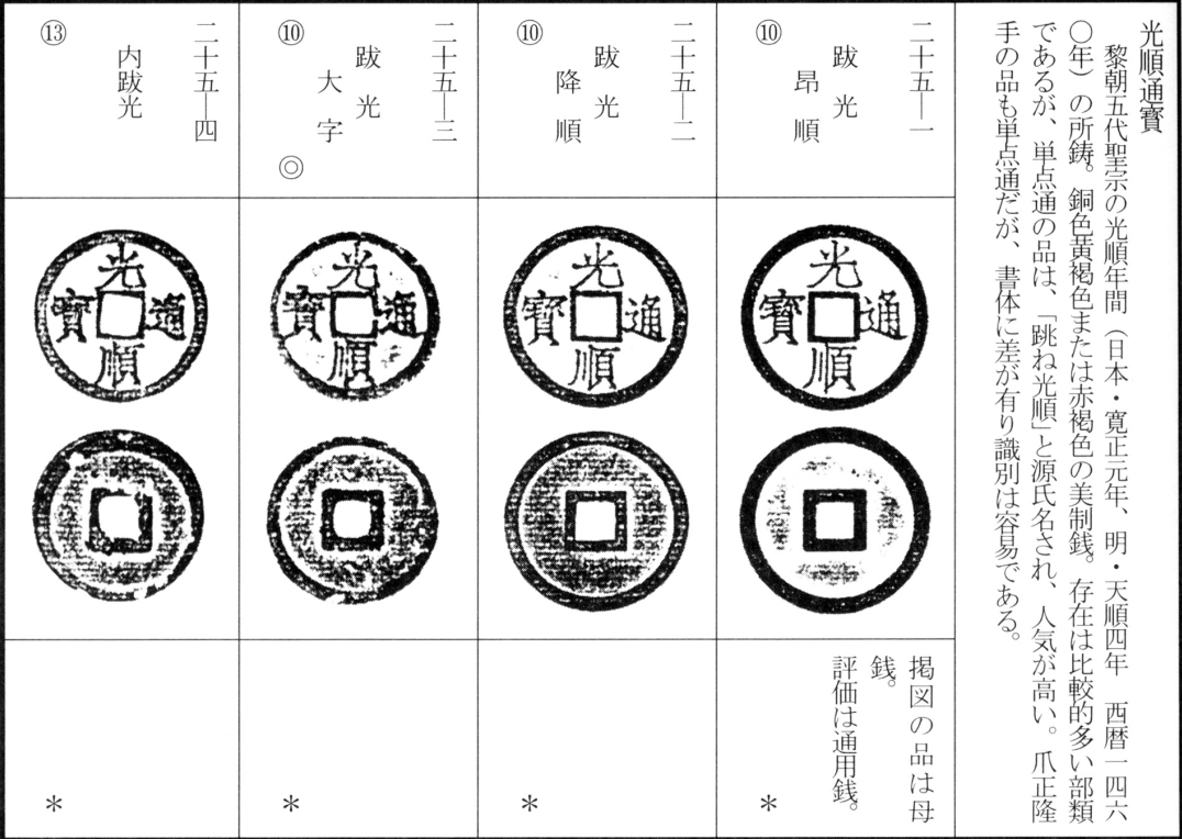 译文:后黎朝第五位皇帝圣宗光顺年间(光顺元年为日本宽正元年,明天顺四年,公元1460年)铸光顺通宝。铜色呈黄褐色或赤褐色,铸造精美。存世量虽属较多品类,但其中被称为"跳光顺"的单点通版别尤为藏家推崇。另有爪正隆手版,虽同属单点通,但因字体差异明显而易与前者区分。