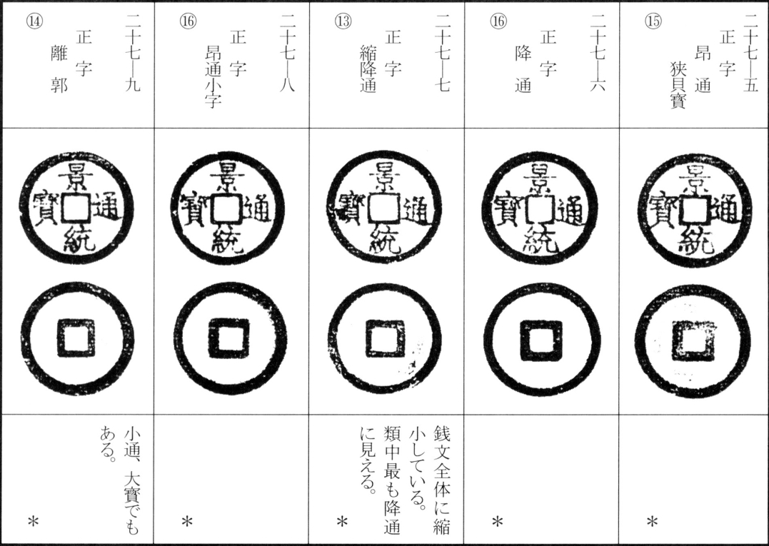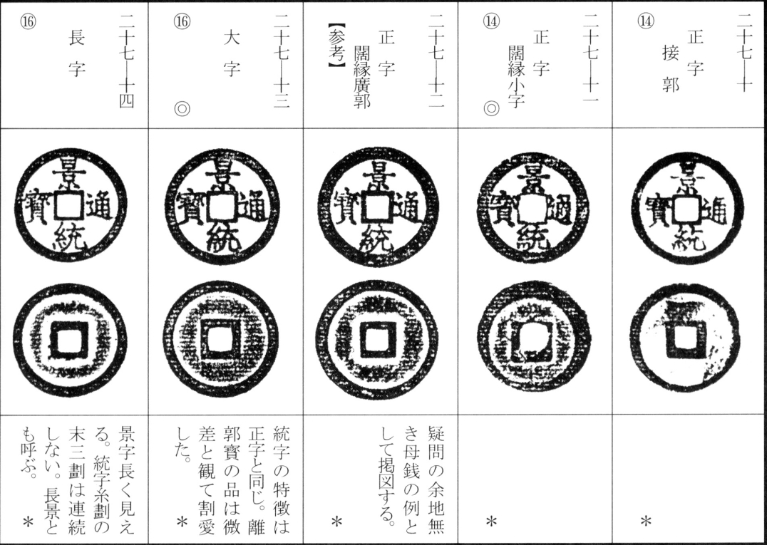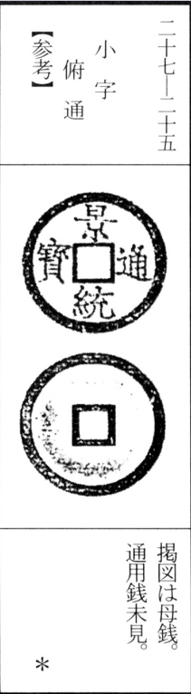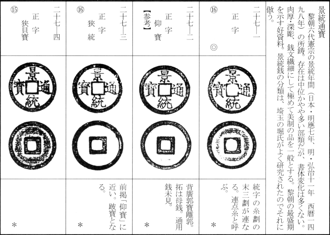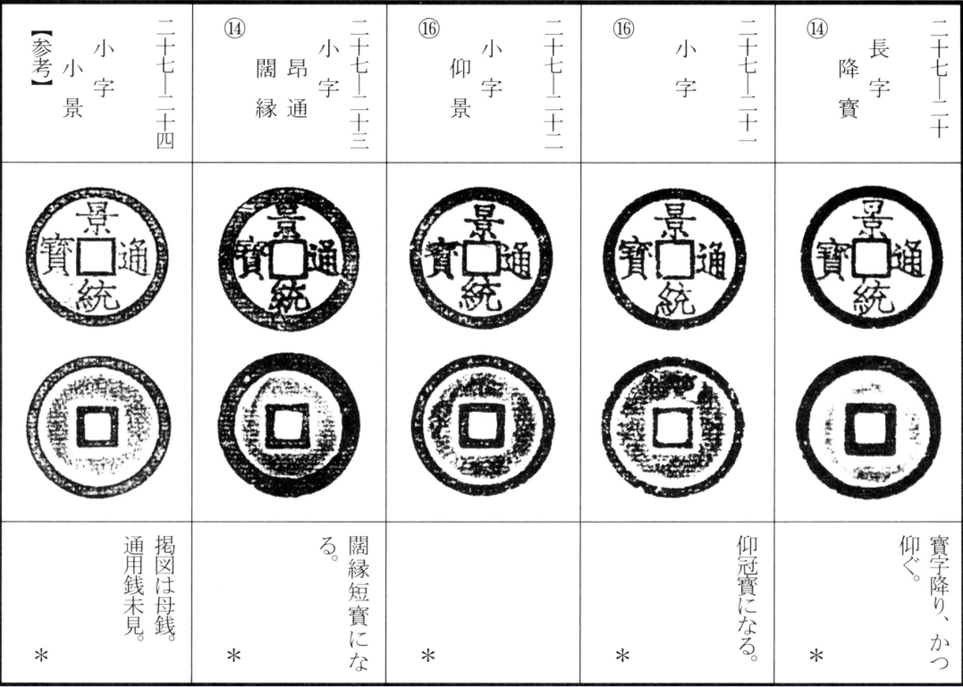 译文:后黎朝第六位皇帝宪宗景统年间(景统元年为日本明应七年,明弘治十一年,公元1498年)铸景统通宝。景统通宝存世数量中等偏多,但字体版式变化较少。钱体厚重、文字深峻纤细,整体铸造工艺极为精美,是反映后黎朝鼎盛时期的重要实物资料。关于景统钱的版别分类,日本埼玉县堀氏的研究最为系统,学界多依从其说。