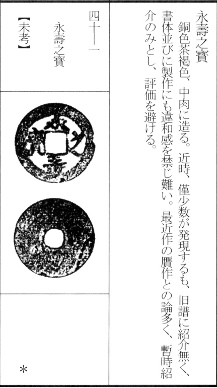 译文:永寿之宝钱呈茶褐色铜质,钱体中等厚度。近年来虽有零星发现,但因旧谱未载,且其文字风格与铸造工艺颇多疑点,钱币界多认定为近年新仿之作。此处暂作记录,不予评鉴。