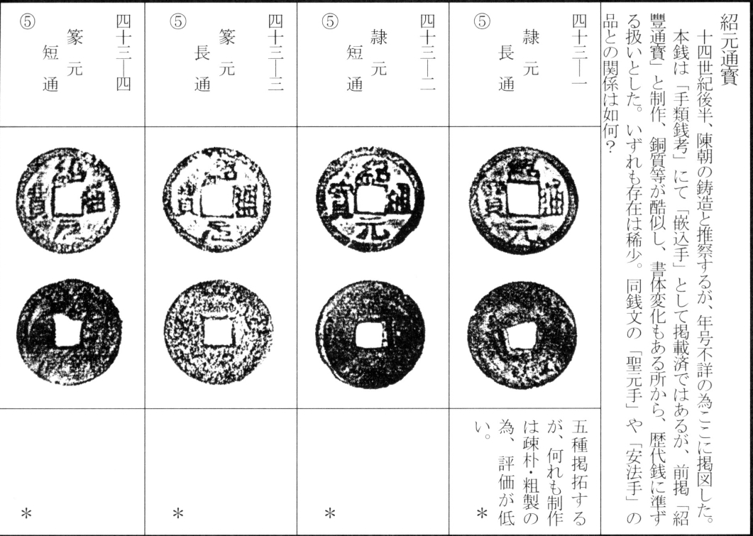 译文:绍元通宝推测为十四世纪后半叶陈朝所铸,因年号不详特此附图说明。虽在《手类钱考》中已被列为"嵌込手"版式,但其制作工艺、铜质特征与前载"绍丰通宝"极为相似,且存在字体变异,故按历代正铸钱币处理。二者存世均甚稀少。另需探讨:此钱与同文异制的"圣元手"及"安法手"版式之间是否存在关联?