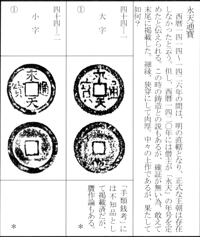 译文:公元1414至1426年间,安南地区为明朝直接管辖,并无正式王朝存在。然史载公元1420年曾有僭主定年号为"永天"。永天通宝或为该时期所铸,但因缺乏确切的证据,故谨慎列于书中。其形制特征为细缘窄孔、钱体厚重,虽属上乘之作,然是否确属该时期所出,犹待考证。