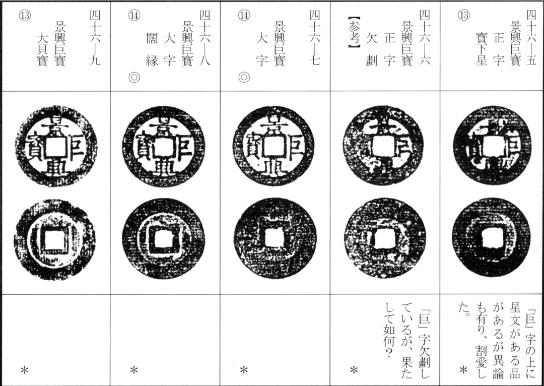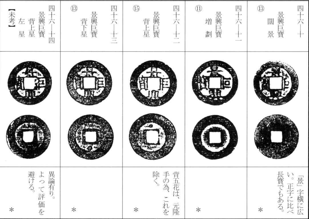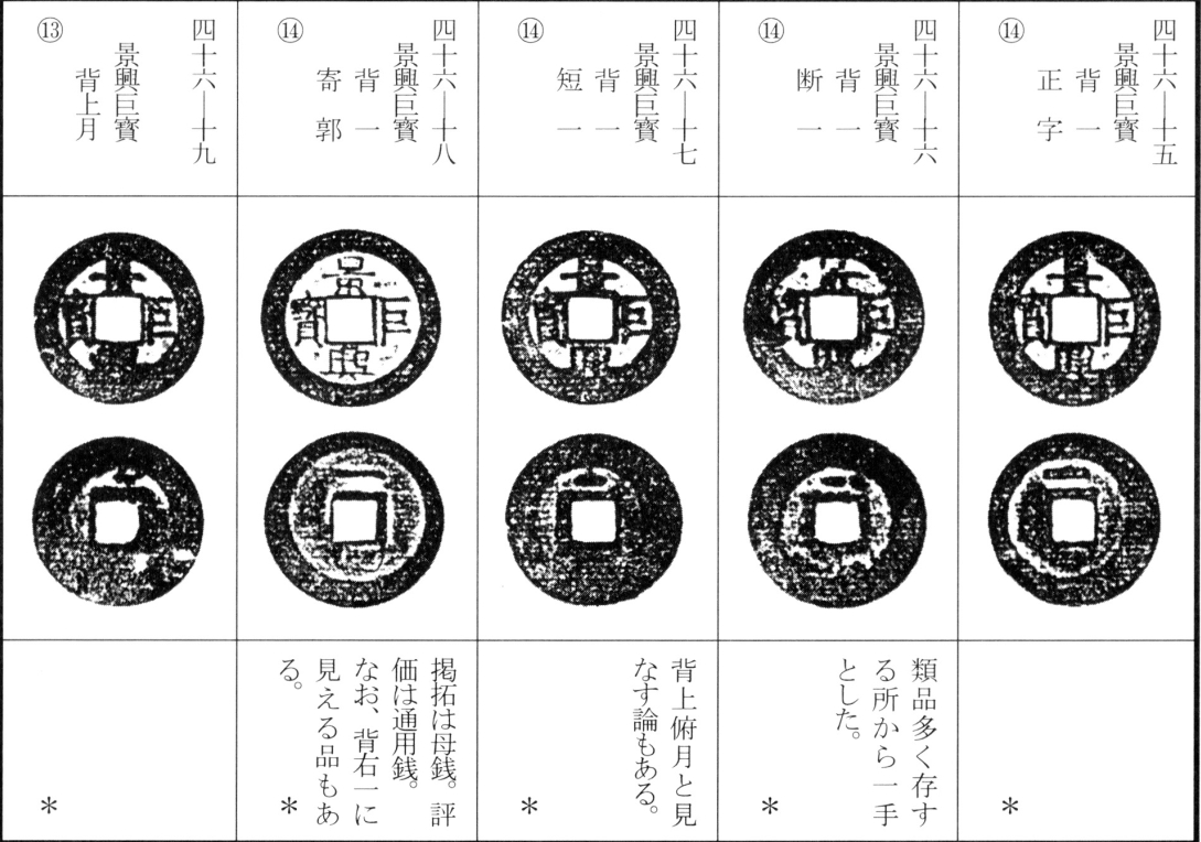 译文:景兴钱除前文所述"通宝"外,尚有巨宝、重宝、泉宝、正宝、至宝、大宝、太宝、永宝、中宝、用宝、内宝、顺宝等各类钱文。据考这些钱币多铸于景兴二十三年(惟"顺宝"为景兴三十七年铸造),部分铸有铸造地铭文。其存世量差异悬殊,自相对稀见至普通常见者皆有。另需说明,之宝、宋宝钱迄今未见实物存世。