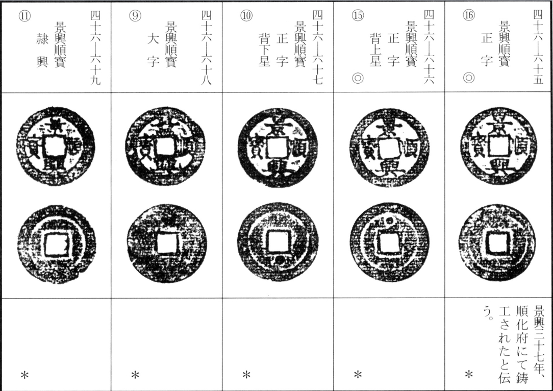 景兴钱除通宝外,尚有巨宝、重宝、泉宝、正宝、至宝、大宝、太宝、永宝、中宝、用宝、内宝、顺宝等各类钱文。据考这些钱币多铸于景兴二十三年(惟"顺宝"为景兴三十七年铸造),部分铸有铸造地铭文。其存世量差异悬殊,自相对稀见至普通常见者皆有。另需说明,之宝、宋宝钱迄今未见实物存世。