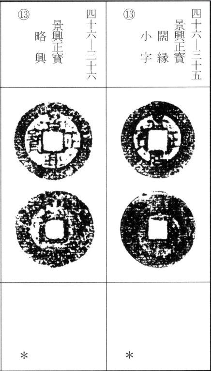 景兴钱除通宝外,尚有巨宝、重宝、泉宝、正宝、至宝、大宝、太宝、永宝、中宝、用宝、内宝、顺宝等各类钱文。据考这些钱币多铸于景兴二十三年(惟"顺宝"为景兴三十七年铸造),部分铸有铸造地铭文。其存世量差异悬殊,自相对稀见至普通常见者皆有。另需说明,之宝、宋宝钱迄今未见实物存世。