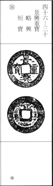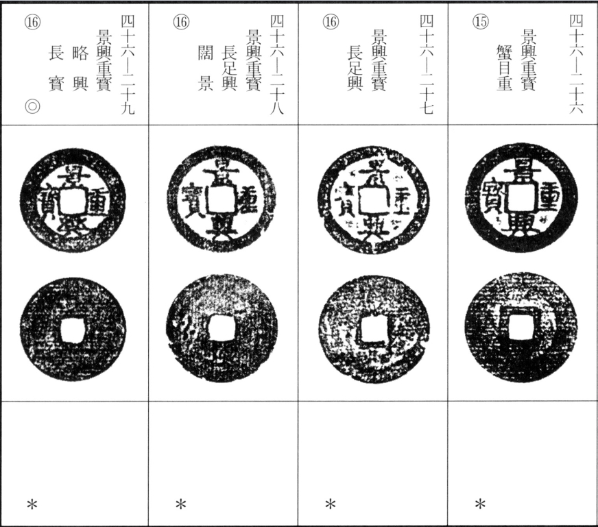 景兴钱除通宝外,尚有巨宝、重宝、泉宝、正宝、至宝、大宝、太宝、永宝、中宝、用宝、内宝、顺宝等各类钱文。据考这些钱币多铸于景兴二十三年(惟"顺宝"为景兴三十七年铸造),部分铸有铸造地铭文。其存世量差异悬殊,自相对稀见至普通常见者皆有。另需说明,之宝、宋宝钱迄今未见实物存世。
