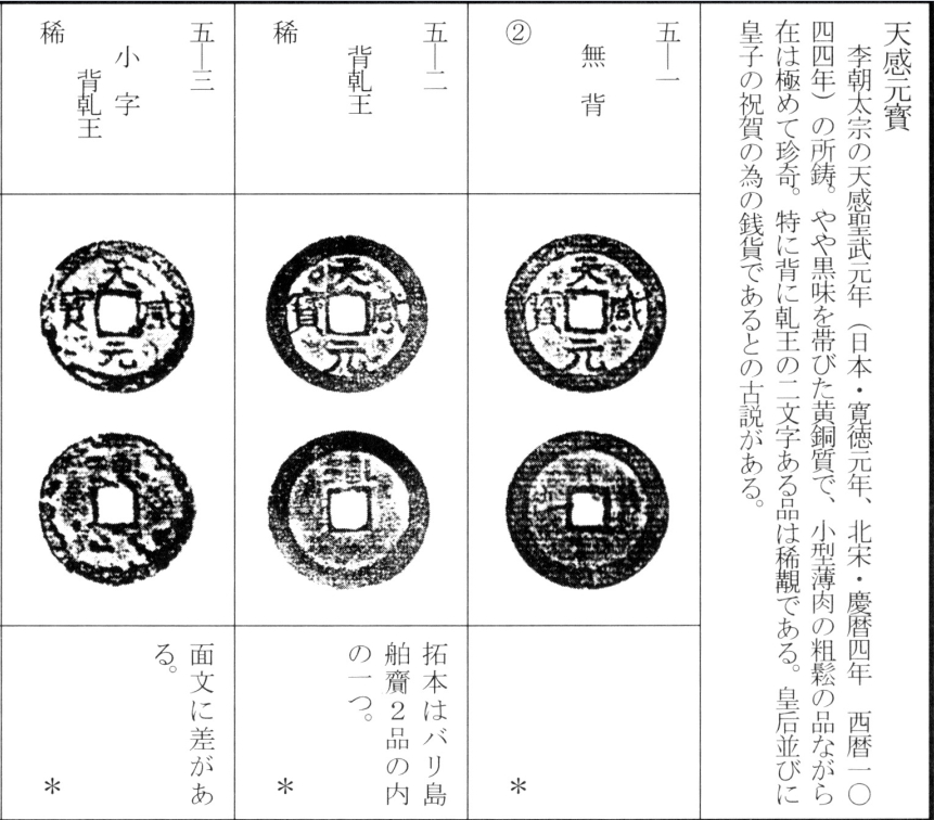 译文:李朝太宗于天感圣武元年(日本宽德元年,北宋庆历四年,公元1044年)所铸。此钱为略带黑泽的黄铜质地,虽属小型薄肉、质地粗松之品,但存世极为珍罕。钱背铸有"乾王"二字者尤为稀见。据古代文献记载,此钱或为庆贺皇后及皇子所铸之纪念钱币。