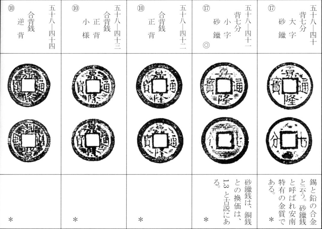 译文:越南(指阮朝)世祖阮福映灭西山朝后,改国号为"越南",并于嘉隆年间(嘉隆元年为日本享和二年,清嘉庆七年,公元1802年)始铸嘉隆通宝。此钱虽铜色变化丰富,然多见形制硕大、质地厚重的精品,足见当时国势之昌隆。其间更出现安南特有的砂鑑钱,该钱整体存世量甚巨。