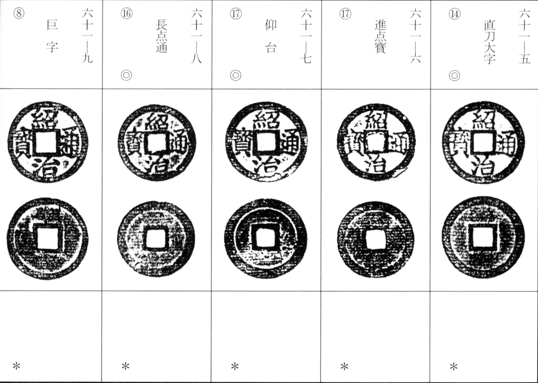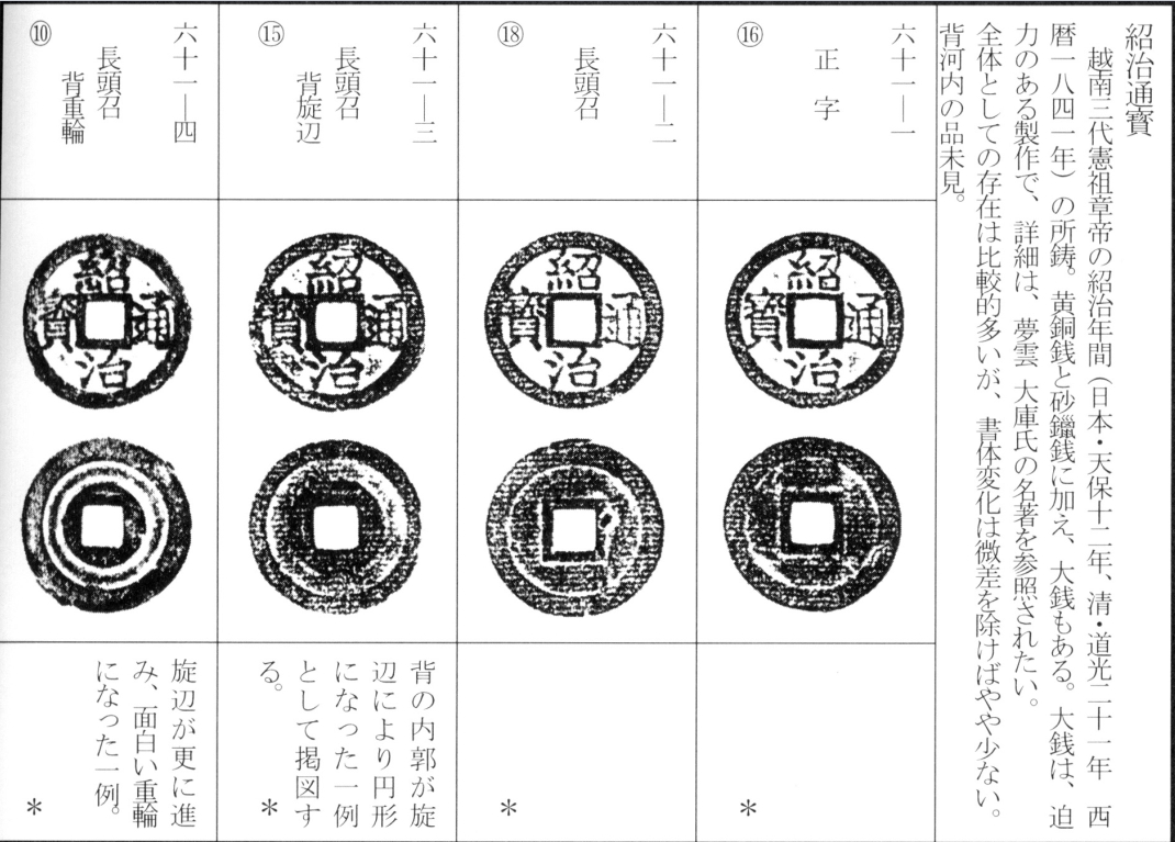 译文:绍治通宝为越南阮朝第三位皇帝宪祖章帝(绍治帝)绍治年间(绍治元年为日本天保十二年,清道光二十一年,公元1841年)所铸。除黄铜钱与砂鑼钱(粗铸劣质钱)外,亦有大钱(美号大钱)存世。大钱铸造精良、工艺精湛,详情可参阅梦雲大库氏之专著。整体存世量较多,除细微差异外,钱文书体变化较少。目前尚未发现背文‘河内’之品。