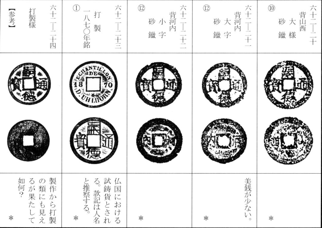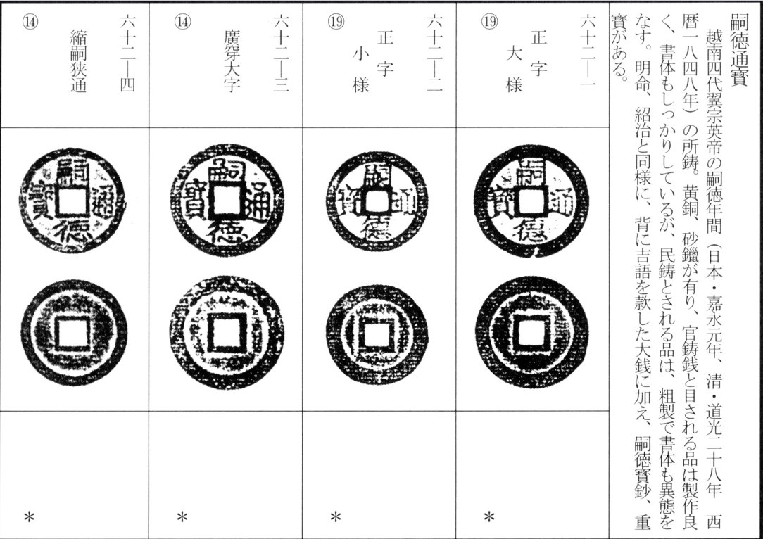 译文:嗣德通宝为越南阮朝第四位皇帝翼宗英帝(嗣德帝)嗣德年间(嗣德元年为日本嘉永元年,清道光二十八年,公元1848年)所铸。钱币材质包括黄铜与砂鑑(粗铸劣质铜钱),其中官方铸造的钱币工艺精良、文字规整,而民间私铸品则粗劣且字体变形。与明命、绍治钱类似,除背面铸有吉语的大钱(美号大钱)外,还有‘嗣德宝钞’和‘嗣德重宝’等钱币。