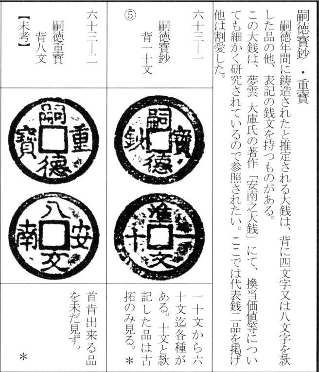 译文:嗣德重宝、嗣德宝钞据推测是嗣德年间铸造的大钱,除背面铸有四字或八字吉语者外,亦有带有特殊铭文的品种。此类大钱的兑换比值等细节,在梦雲大库氏著作《安南之大钱》中已有详尽研究,可供参考。本文仅列举两枚代表性钱币,余者从略。