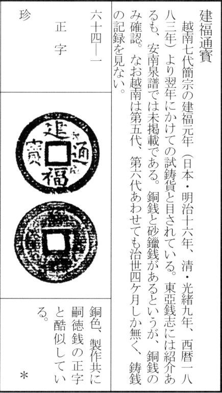 译文:建福通宝为越南阮朝第七位皇帝简宗建福元年(日本明治十六年,清光绪九年,公元1883年)至次年所铸试铸钱,据考当属试样货币。《东亚钱志》虽有载录,然《安南泉谱》未予收录。传闻该钱有铜钱与砂鑑钱两种,现仅铜钱实物可考。另需说明,越南第五代、第六代帝王合计在位仅四月,未见铸钱记录。