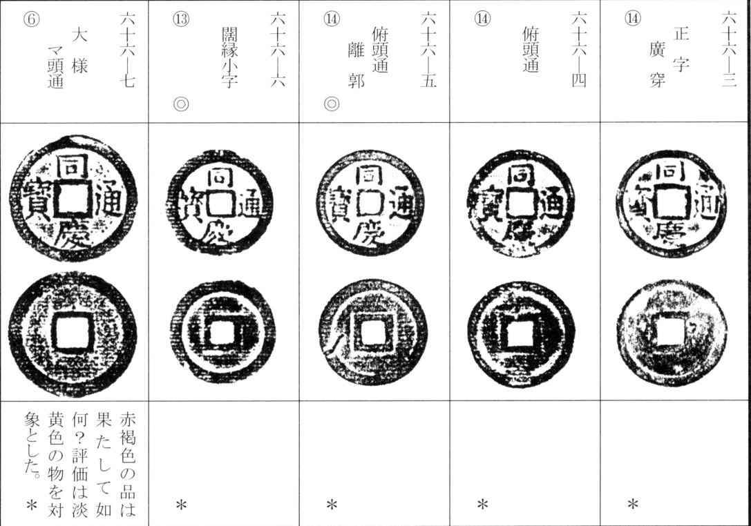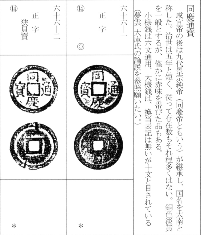 译文:咸宜帝之后由第九位皇帝景宗纯帝(亦称同庆帝)继位,改国号为"大南"。其治世仅五年,故该钱存世量不甚丰沛。钱体多呈淡黄色铜质,间有微带赤色者。其中小型钱当六文通行,大型钱虽无明确兑换标识,然学界多认定为当十文(可参阅梦雲大库氏相关论述)。