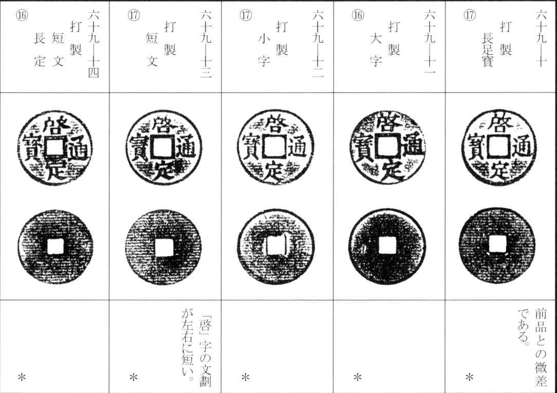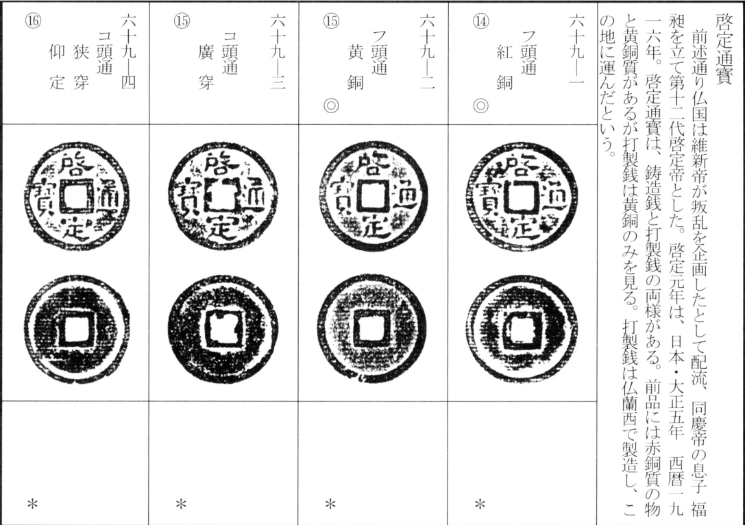 译文:如前所述,法国以维新帝密谋叛乱为由将其流放,改立同庆帝之子福昶为阮朝第十二位皇帝启定帝(启定元年为日本大正五年,公元1916年)。启定通宝分为铸造钱与打制钱两类:前者兼有赤铜与黄铜材质,后者则仅见黄铜。据考,打制钱系法国铸造后再运回越南。