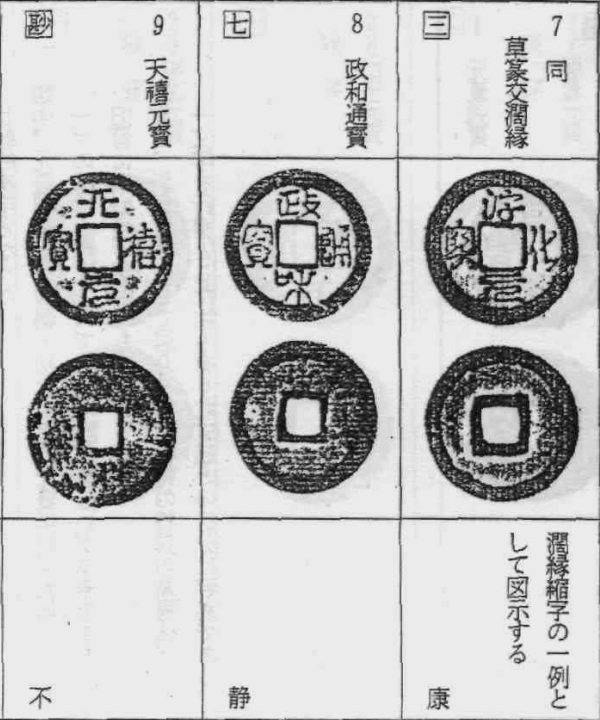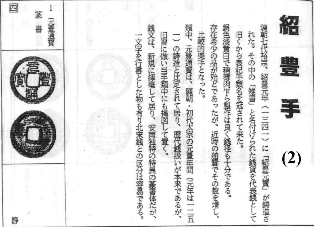 译文:陈朝第七位皇帝裕宗在位时,绍丰元年(1341年)铸造了“绍丰元宝”。其中被称作“杂书”的钱币作为代表钱,自古以来就被赋予表记类的名称。其铜色淡黄白色,虽稍薄但制作精良,钱径也颇为标准。过去这类钱币大多稀少,近年因越南舶来而数量增多,变得较易入手。同类之中,元丰通宝被认定为陈朝初期太宗元丰年间(元年为1251年)所铸,本应按历代钱币的惯例归类,但沿袭旧例归类为手类钱并附图记录。钱文风格新颖,是安南独有的奇异篆书体,不过也有将单个字写成行书的,与北宋钱币的区分并不困难。