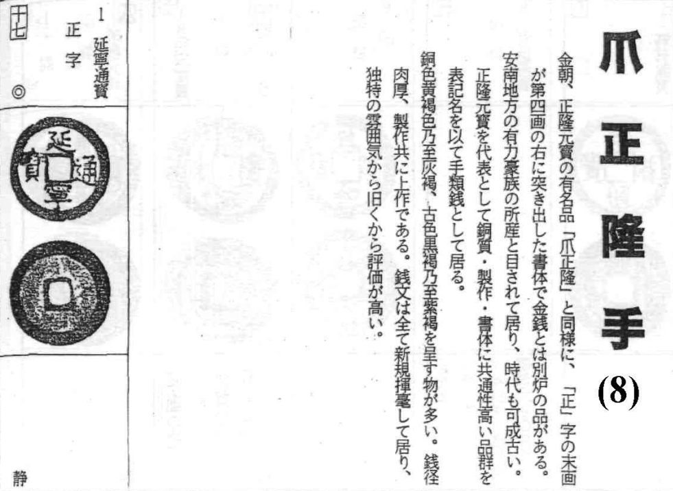 译文:爪正隆手以金朝知名钱币正隆元宝为代表钱,“正”字的末笔画向第四画的右侧突出,其字体风格有别于常规金朝钱币的铸炉制品。