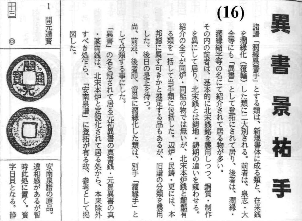 译文:各类钱谱中关于“阔缘异书手“这类钱币的分类,一种分为用新的书法写成,另一种是在现有钱币的基础上阔缘化,大致分为这两类。前者在《泉志》、《古泉大泉》等钱谱中也记录为”异书“,后者则多被称为阔缘、阔缘缩字予以介绍。
