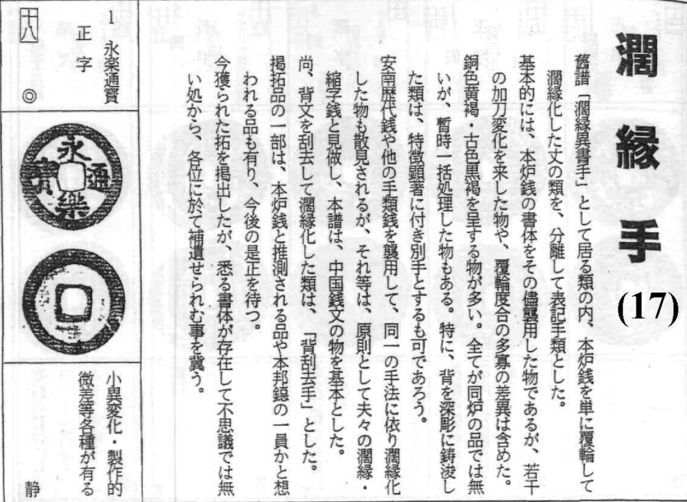 译文:在旧谱(指《安南泉谱》)中归类为“阔缘异书手”的钱币里,现将官炉钱单纯的进行阔缘化的这类品种分离出来,单独列为一个手类(即阔缘手)。