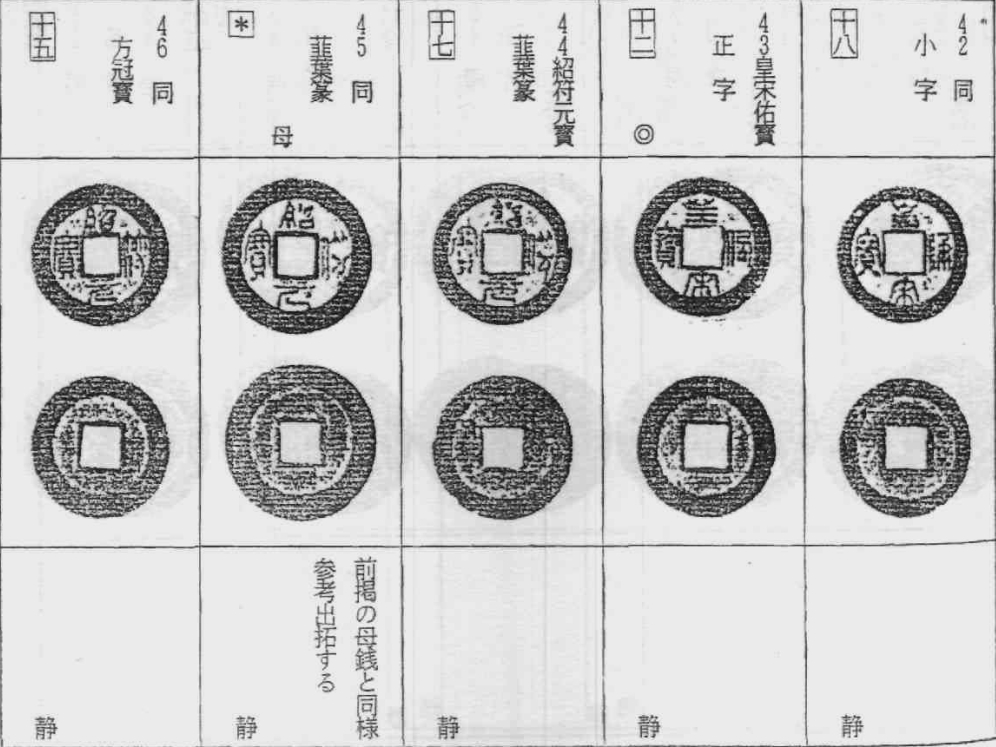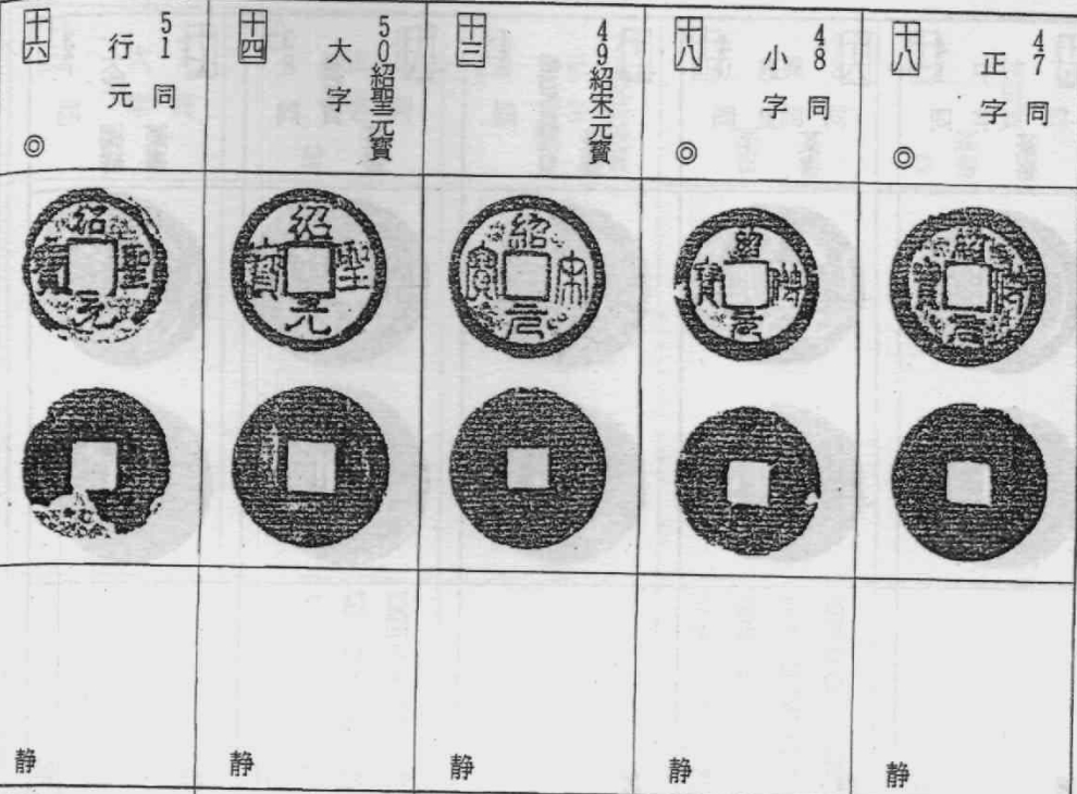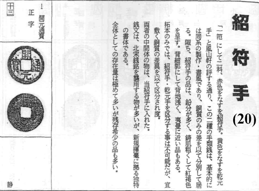 译文:正如风山轩所评价的那样,“同一个钱范两种铜料”,呈红色的为绍符手,呈黄色的为乾元手。这两种手类钱在铸造方面和文字风格上基本属于同一体系,主要通过铜质的不同来进行区分。具体来看,绍符手系列钱的含铅量较高,铸造得比较粗糙,呈红褐色。背面细郭地章浅,部分钱币甚至接近磨损不清的状态。