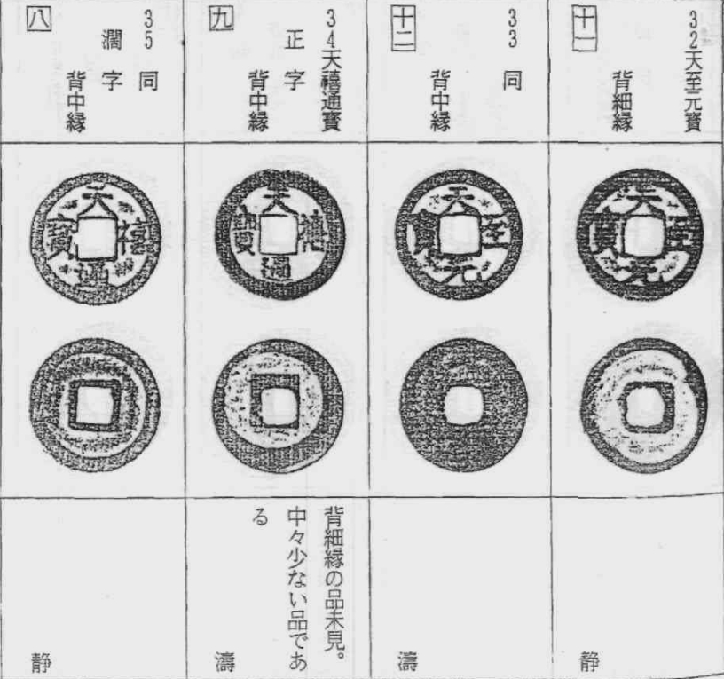 被归类为“天至至元手”的这些钱币,在增尾氏的《东洋古钱图录》中首次以“天至手”和“至元手”这两个手类进行了介绍。在《东洋古钱图录》中,背中缘且浅背的品种归类为“天至手”,背细缘且深背的品种归类为“至元手”。本谱虽然沿用了这一说法,但根据后来的陆续研究发现,确认了同一面文只是存在两种背型而已。因此,本谱将“天至手”和“至元手”合并为一个手类,称之为“天至至元手”。
